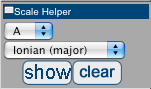 The Scale tool is used to overlay the notes of a scale on the fretboard. It is a visual guide to help you make guitar tab. The Tool has a two selections, the key of the scale, and the type of scale. There are two buttons, the
